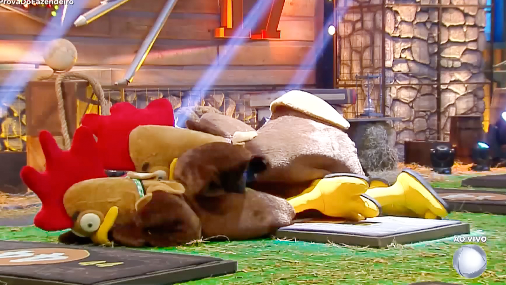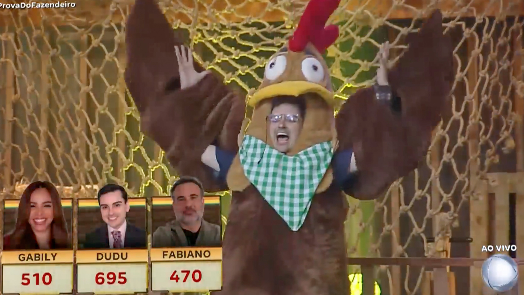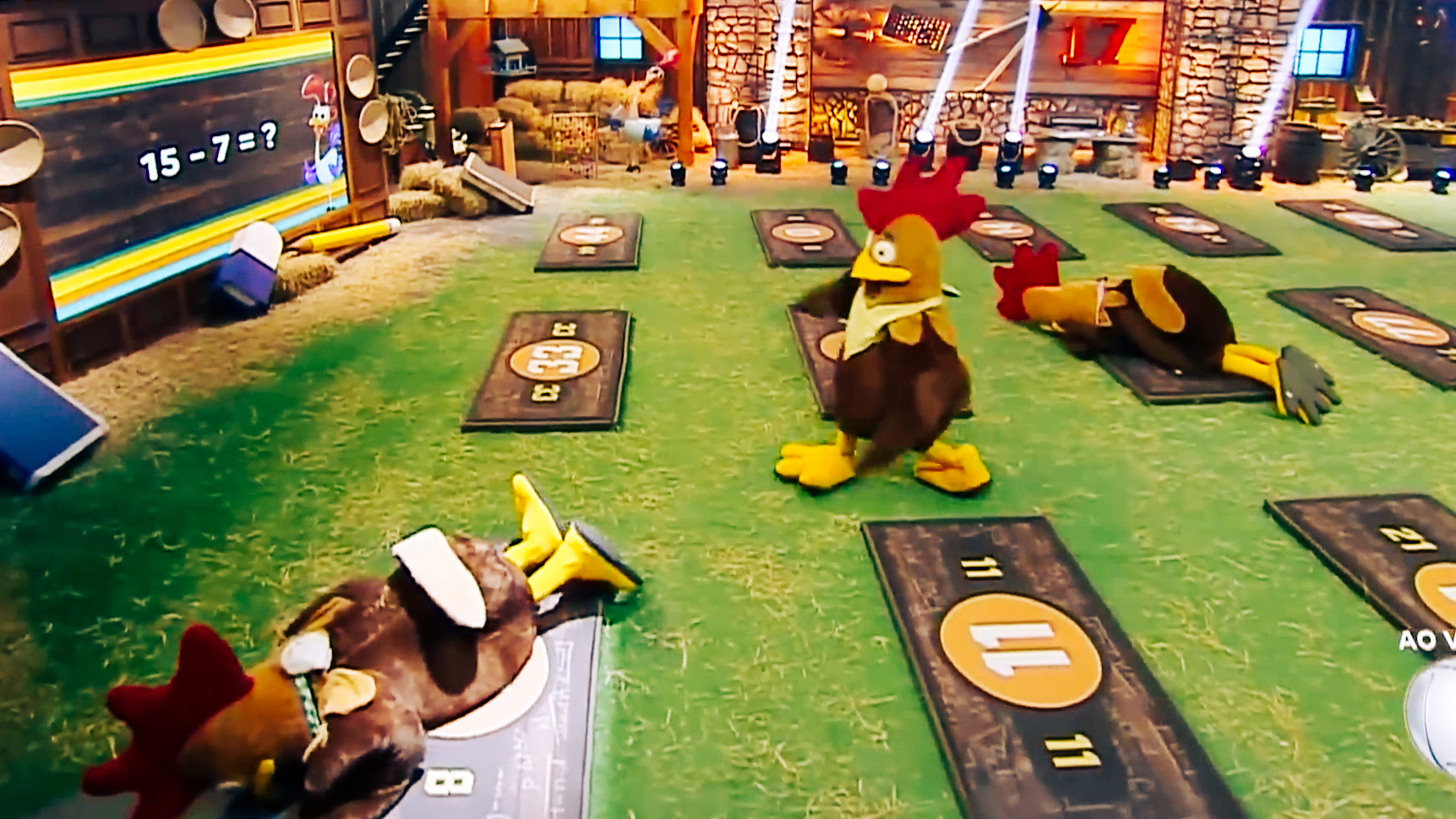 A prova acontece em rodadas. Três peões, vestidos de galo, partem de suas bases e escutam a pergunta de matemática. Ao sinal sonoro, a corrida começa. Chegar primeiro não basta: é preciso se jogar sobre a resposta escolhida. Quem acerta primeiro soma mais pontos; quem pula na opção errada não pontua. A cada rodada, os valores mudam e a pressão cresce. Depois de responder, os peões voltam para a base e tudo recomeça. No final, quem acumular mais pontos fica com o chapéu do Fazendeiro.